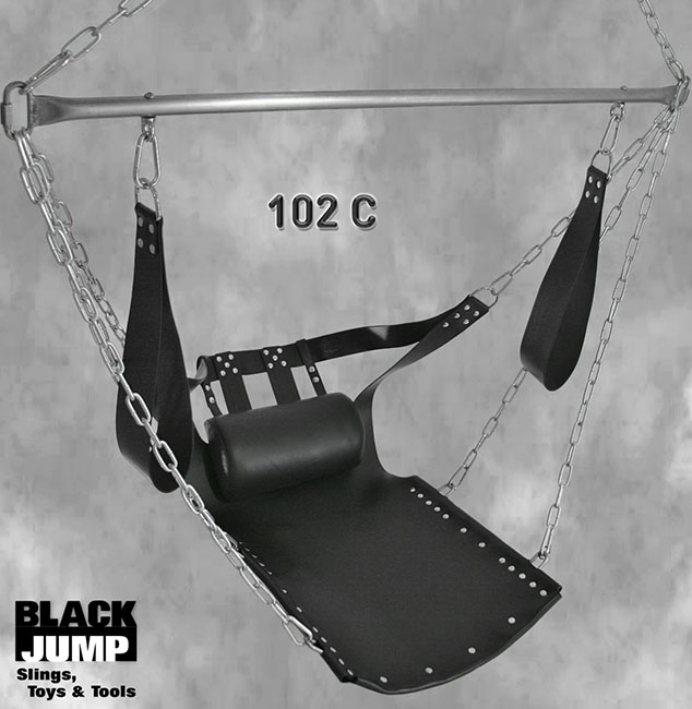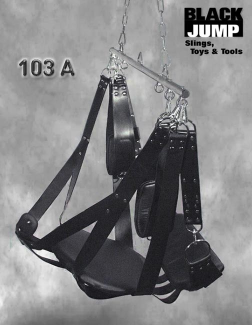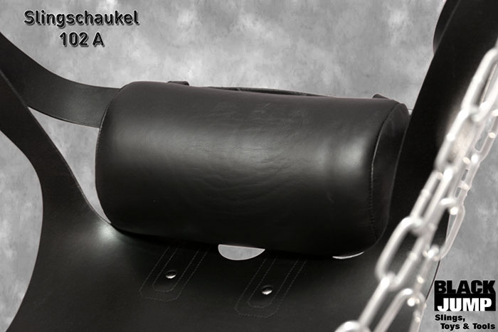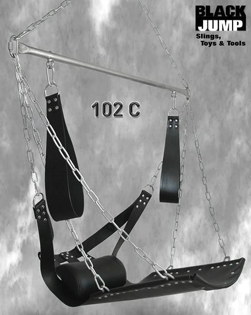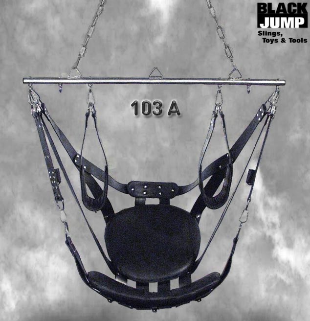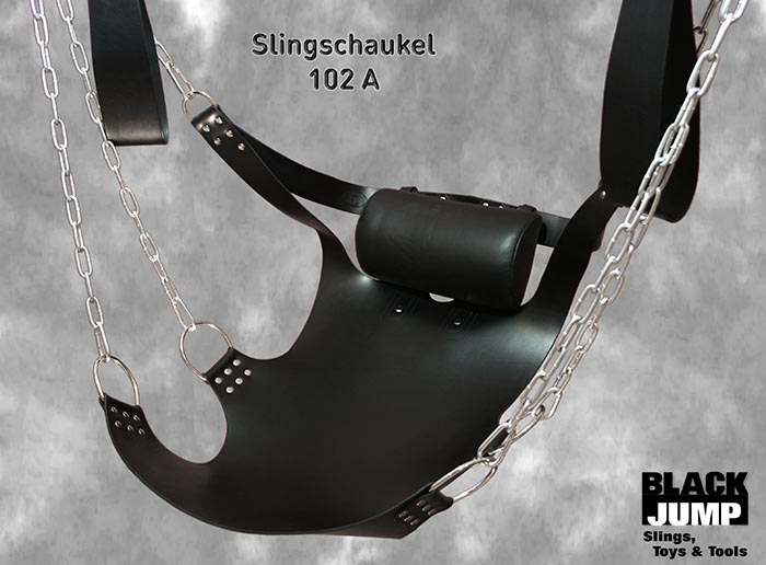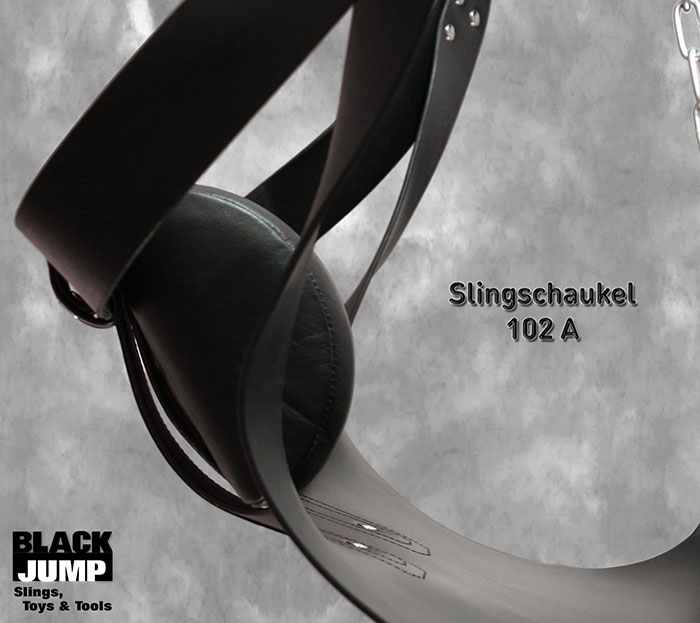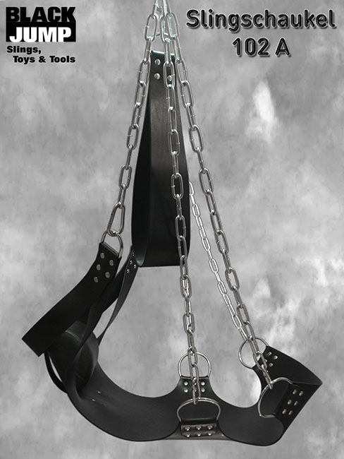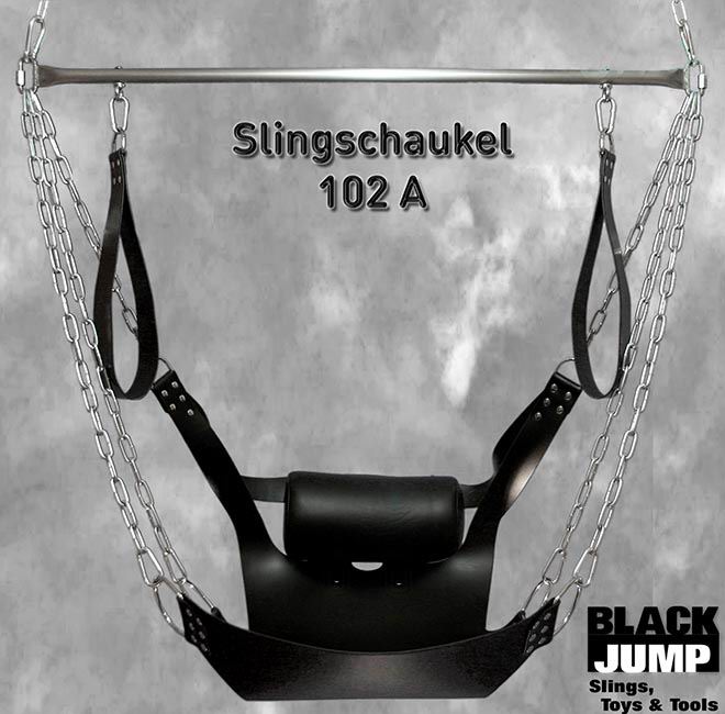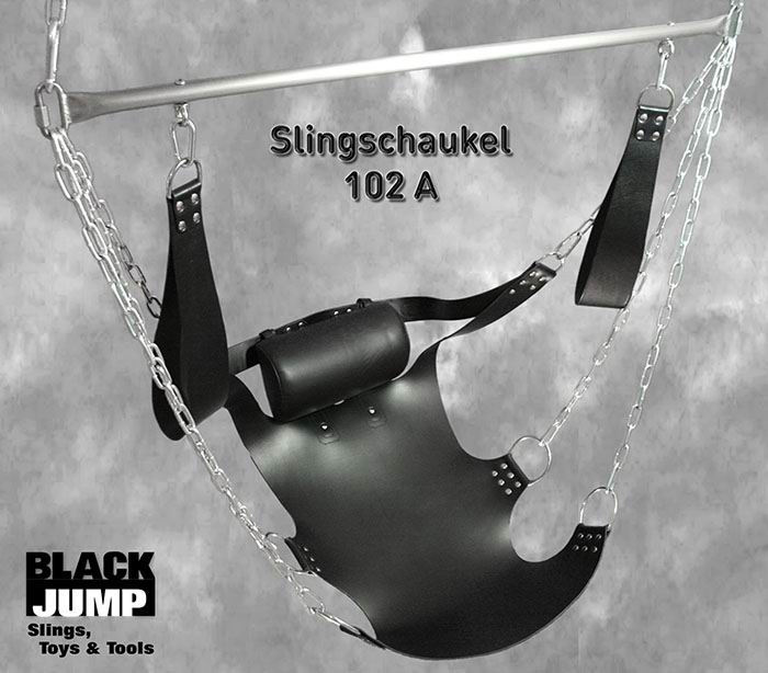 Die sehr stabile Glattlederschaukel ist bestückt mit einer bequemen Nackenhalbrolle, breiten Fußschlaufen, allen nötigen Ketten und Karabinern und der stabilen VA Stange Standard, die mit einem oder zwei Haken in der Decke montiert werden kann. Auch bei diesem Modell handelt es sich um ein von mir seit Jahrzehnten immer weiterentwickeltes Original, auch wenn andere Anbieter einen auf Masse konzipierten, billigen Nachbau davon anbieten und behaupten, dies sei ihr eigenes exklusives Design. Blackjump Ein-Punkt-Sling Nr.102 B Slingschaukel ![]() ![]() Ein-Punkt-Leder-Sling an stabiler VA Stange mit seitlichen Aufhängungen aus Leder, statt wie bei Modell A (gleich hier drüber) mit Ketten. Incl. Nackenkissen, Karabinern und der stabilen VA Stange Standard.