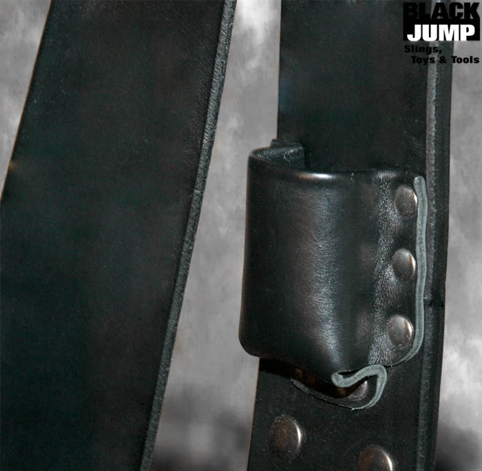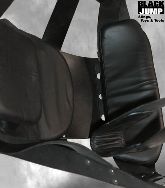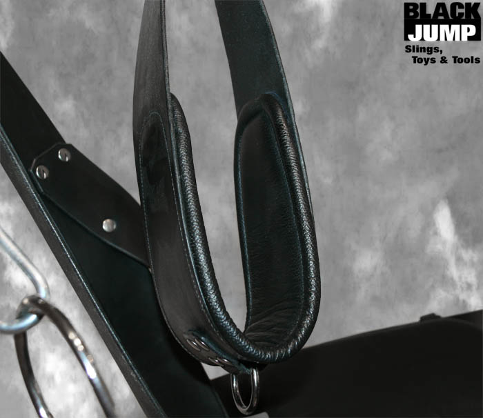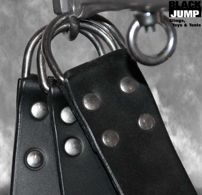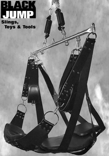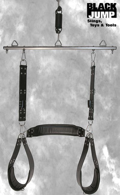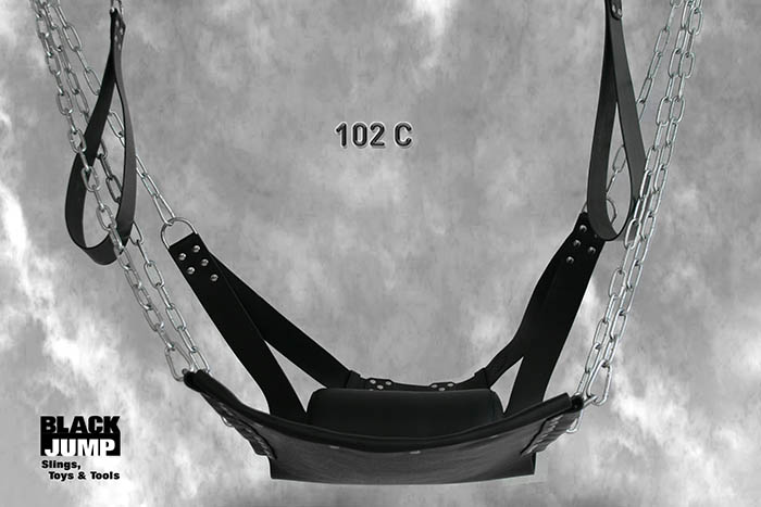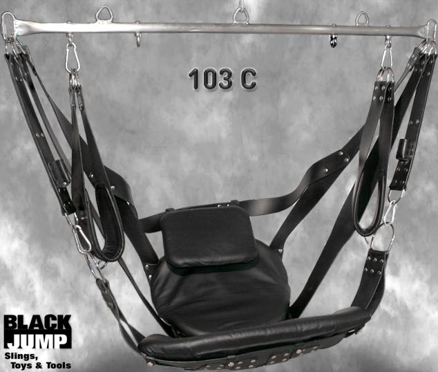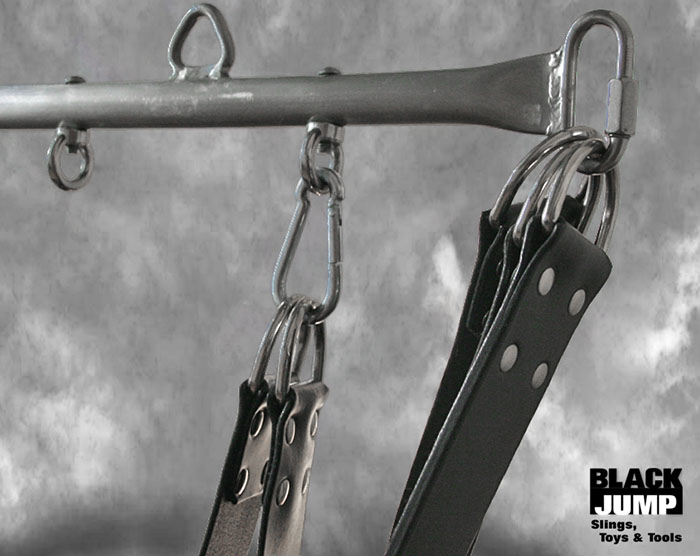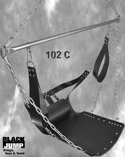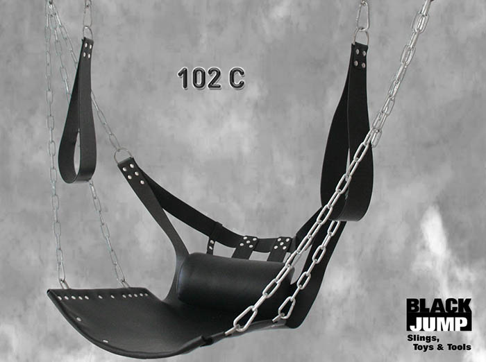 Die sehr stabile Glattlederschaukel ist bestückt mit einer bequemen Nackenhalbrolle, breiten Fußschlaufen, allen nötigen Ketten und Karabinern und der stabilen VA Stange Standard, die mit einem oder zwei Haken in der Decke montiert werden kann. Auch bei diesem Modell handelt es sich um ein von mir seit Jahrzehnten immer weiterentwickeltes Original, auch wenn andere Anbieter einen auf Masse konzipierten, billigen Nachbau davon anbieten und behaupten, dies sei ihr eigenes exklusives Design. Blackjump Ein-Punkt-Sling Nr.102 B Slingschaukel ![]() ![]() Ein-Punkt-Leder-Sling an stabiler VA Stange mit seitlichen Aufhängungen aus Leder, statt wie bei Modell A (gleich hier drüber) mit Ketten. Incl. Nackenkissen, Karabinern und der stabilen VA Stange Standard.