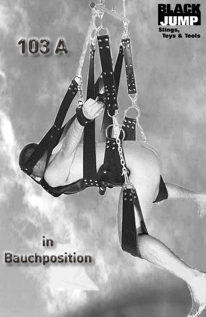 ![]() In den zwei Jahrzehnten seiner Entwicklung ist das Model 103 zu dem Klassiker unten den Luxus-Leder-Slings herangewachsen. Nur hier im Original in der aktuellen Version und in unübertroffener Qualität erhätlich. Oft kopiert, doch nie erreicht besticht dieser schwebende Liebessessel durch edelste Materialien und Leder in einer Stärke, die ihresgleichen sucht. Multi-Funktions-Sling: Der Sling lässt sich auch als Sitz-Sling aufbauen! Bodenplatte aus extrem starkem Leder. Enorm stabile Konstruktion und bestmögliche Körperunterstützung im Rücken. Dadurch ist dauerhaft ein gleichbleibender ruhiger Liegekomfort gewährleistet! Für Aufhängung an einem oder zwei Haken in der Decke geeignet. Wird inkl. Kopfkissen, PP-Halterungen in den Seitenteilen, zwei BJ Spezialfedern und der VA Spezialstange geliefert. Blackjump Ein-Punkt-Sling 103 A ![]() Durch stauchbare Lederriemen als Boden passt sich der Sling der Körpergröße an und ermöglicht auch einen weiteren Aufbau in Bauchlage!